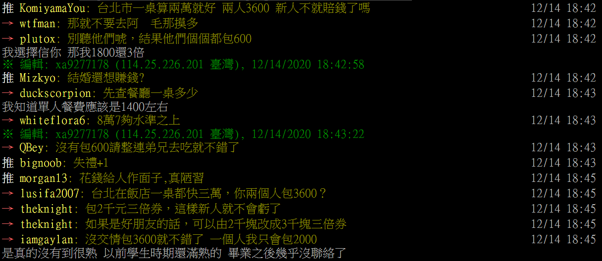 原PO在《批踢踢實業坊》中說到,他準備要攜伴去參加另一位朋友辦在台北的婚禮,原本想說兩個人一起包個3600元應該差不多,沒想到其他友人紛紛表示3600元只夠一個人去,令他相當震驚。原PO更表示,在他年輕的時候1個人包3600元的紅包是「超好的朋友」才有的待遇,現在竟然已經是低標,讓他在文末傻眼的說到:「還是經濟起飛太久我沒跟上?」