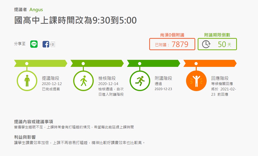 本月12日,有位網友在「公共政策網路參與平台」提議國高中上課時間改9點半到5點的連署,表示因為普遍學生睡眠不足,上課時常會有打嗑睡的情況,希望能藉由這個連署延緩上課時間,且該名網友還強調,這樣的改動,會讓學生讀書效率加倍,上課不再容易打瞌睡,精神比較好讀書效率也比較高。今(25日)為止,目前已經有7879人附議,正式通過附議階段,現在只需等待相關機構在明年2月23日以前回應。