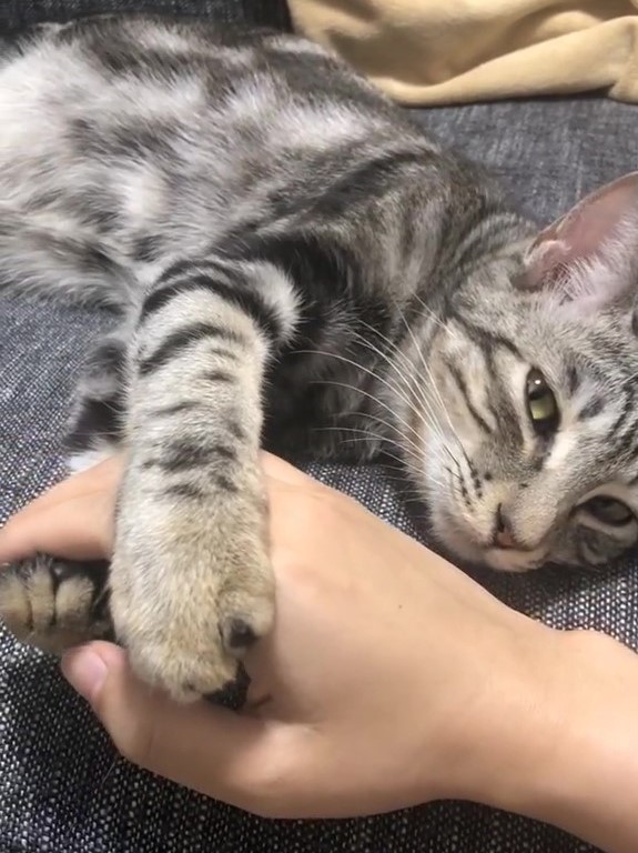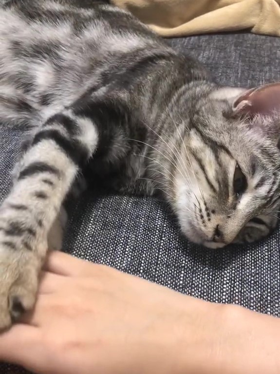 只見貓貓抱著主人的手手安然地躺在沙發上,閉著眼睛像是進入了甜蜜夢鄉,主人看牠睡得似乎挺好,便輕輕悄悄地要將手移開,然而就在手快要抽離之際,貓貓卻突然醒來,還反過來伸手勾住主人的手,「馬麻妳要去哪?不准走~~」。