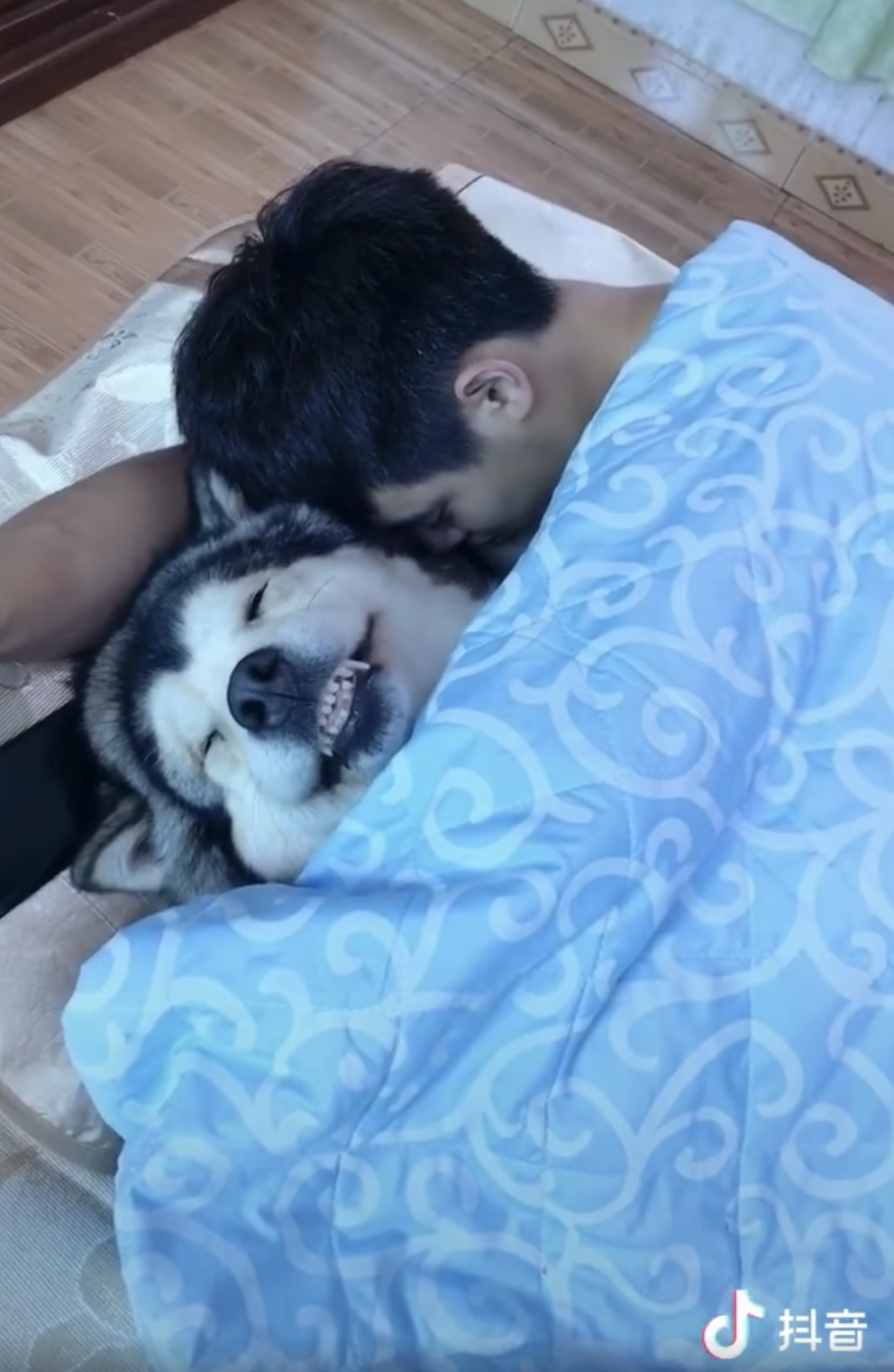▼從影片中可以看到,一隻阿拉斯加雪橇犬和男主人躺在被窩裡。狗狗雙眼閉著還在睡覺,但臉上掛著大大的笑容。牠聽到馬麻的腳步聲,很快從睡夢中醒來,轉過頭去看了一眼,一臉睡眼惺忪的表情,好像在說 :「這個男人是我的,不要打擾我們,走開」