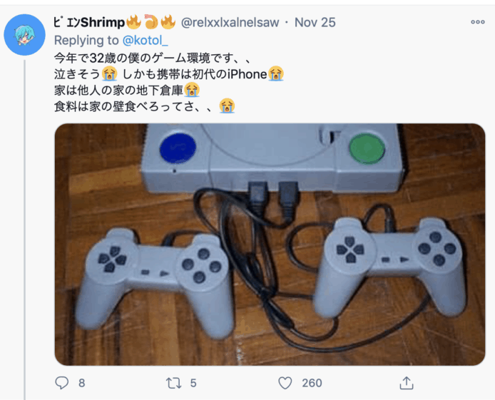 有日本女網友最近在 Twitter,分享自己玩遊戲的環境,並且分享自己擁有的電子產品清單,有雙屏幕、鍵盤、滑鼠、麥克風等遊戲裝置,並自稱就讀中學二年級,隨即引起大量網友議論,有人表示羨慕,亦有人認為她被父母寵壞,其實是用父母的錢炫耀,而她隨後亦承認這些裝置確實是父母買給她的,她表示很感謝父母。