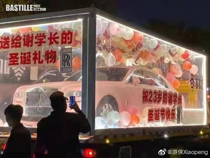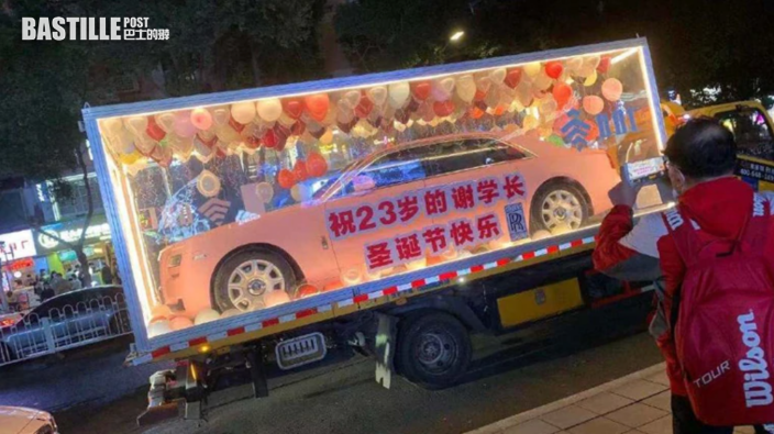 綜合內媒報道,一輛小貨車在12月24日平安夜晚上,載著一輛粉紅色勞斯萊斯抵達廣州中山大學門口,上方的透明貨櫃內放滿色彩繽紛的汽球,還貼上「送給謝學長的聖誕禮物」、「祝23歲的謝學長聖誕節快樂」等祝福語,吸引大批學生及途人駐足圍觀,紛紛舉起手提電話拍照留念。