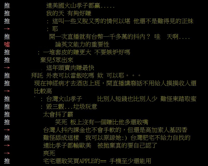 不過也有網友持相反意見,「這麼好賺怎麼不大家都去賺?重點人家就是有本事啊」、「人口基數在那裡,美國就4億人,還要算全球英語群觀眾,所以不用怪她,人往高處爬」、「她這個直播平台不用抽成嗎?有些直播平台都要抽一半」、「你也可以做阿,然後知道自己實力在哪」、「沒什麼,用自己的優勢去賺錢,人家有本事」、「人家就是有外貌優勢啊,認清自己乖乖當社畜吧」。
