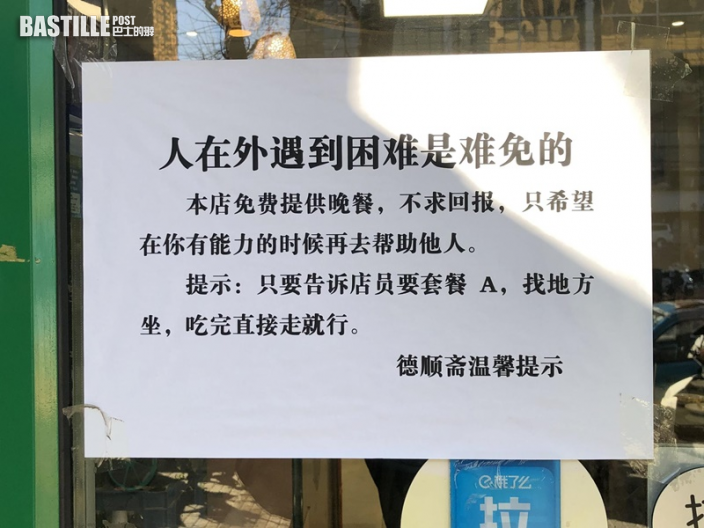 在北京有一間餐館門口貼著吿示,表示該店提供免費晚餐,只要說出暗號,店員便會送上餐點,十分暖心。老闆表示,有此幫人的想法都是因為自己曾獲同樣的幫助,希望獲得幫助的人日後有能力時候再去幫助別人。