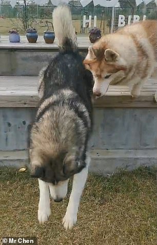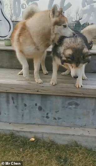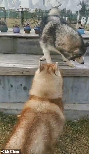 只見畫面中黑毛的盲眼哈士奇在台階上一邊低鳴、一邊來回躊躇,站在高處加上又看不見前方狀況,讓牠感到緊張,這時已經到台階下的棕毛巨寶便又跳上了台階,頻頻蹭著同伴的身體並試圖要叼牠脖子,想要指引牠如何離開台階www