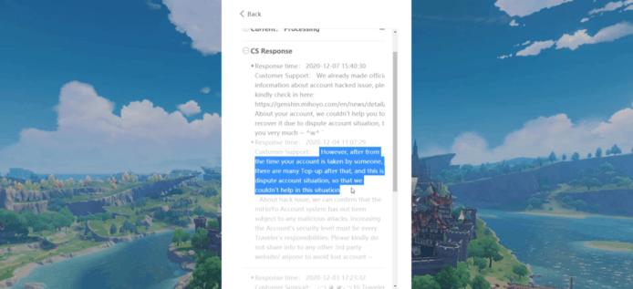 一名外國《原神》玩家,在網上控訴其帳號被盜,因此找米哈遊希望拿回帳號,但米哈遊卻以現時這名玩家的課金量比該持有的玩家多為由,並指這是複雜情況而無法為這名玩家拿回帳號。而該名玩家指他帳號有綁定 email 及 2FA,但指機制似乎形同虛設。而這名玩家更指就算拿回遊戲帳號都已經沒有再玩的動力。