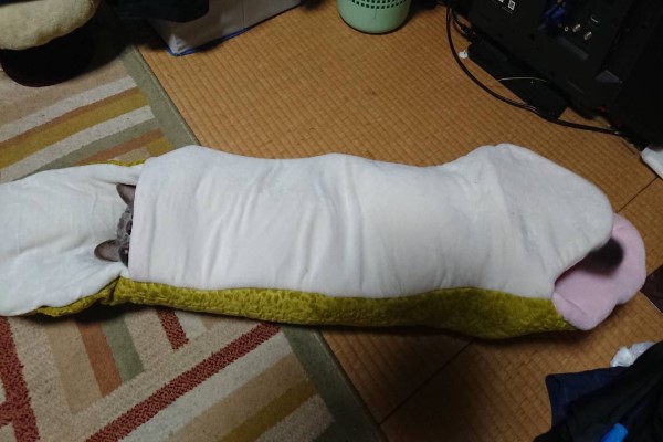 ▼貓咪一直沒有動靜,推主就把隧道翻過來,這才看到貓咪正好卡在蟒蛇肚子裡,滿臉微笑睡得超舒服。