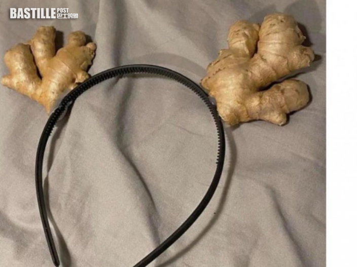 該網民於Facebook群組「香港做設計慘過食屎協會」上投稿,指自製了一個「最窮聖誕服飾」,用生薑及頭箍做了一個鹿角頭飾。