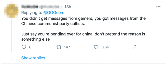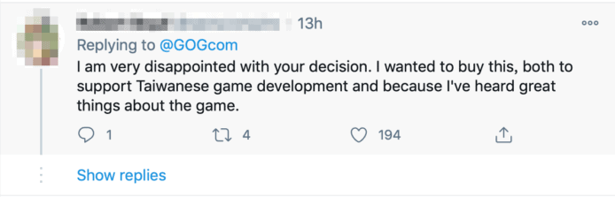 遊戲平台 GOG 於 Twitter 宣佈,在今日稍早的時間,曾宣佈會重新上架遊戲「還願」,但是由於之後收到很多玩家的訊息,決定不會在其平台上架遊戲。據報導,GOG 是 CD Projekt 旗下的遊戲平台,有很多中國網友曾在 GOG 官方微博留言,會一同抵制遊戲《電馭叛客2077》(Cyberpubk2077)。有網友在 Twitter 留言,質疑 GOG 所稱的「很多玩家」是否指中國網民,另外亦有網友表示,對 GOG 的決定感到失望。