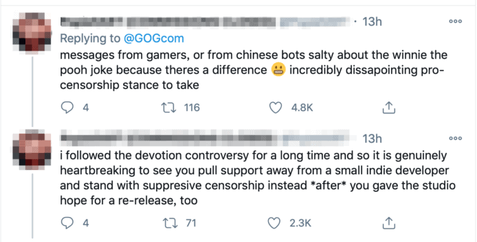 早前遊戲公司赤燭遊戲開發驚悚遊戲「還願」,但有玩家發現遊戲內有「習近平小熊維尼」字眼,隨即引起中國網友不滿,之後遊戲亦被下架。而遊戲公司赤燭遊戲近日就宣佈,「還願」遊戲會在 12 月 18 日於 GOG 遊戲平台重新上架,但是遊戲平台 GOG 就在宣佈後的幾小時,於 Twitter 宣佈,由於收到很多網民訊息,決定遊戲不會在 GOG 上架。