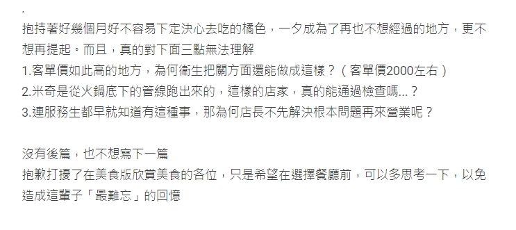 原PO也質疑,橘色涮涮屋一客單價2000元左右,為何衛生把關還能做成這樣,說明米奇是從火鍋底下的管線跑出來的,這樣為何能通過檢查,批評如果連服務生都習慣這種事,店長怎麼沒先解決問題再營業。不少網友看到後紛紛表示「以他的價格這是根本不該出現的失誤啊」、「請去投訴」、「這真的是世界可怕的記憶」。