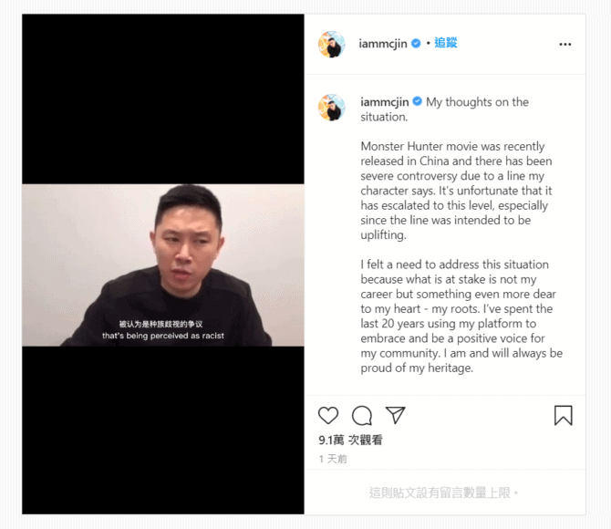 《Monster Hunter》早前被指辱華,因此在中國大陸地區上映僅一日便被下架。近日導演 Paul WS Anderson 出面道歉,並表示未想過從來沒打算向任何人發送歧視或不尊重的信息,承諾全球版本將會刪除該片段。而片中相關演員MC Jin亦在 Instagram 上發文道歉,表示珍視自己的「根」,「永遠為我的血統感到自豪」。