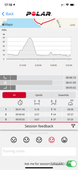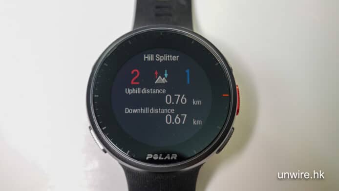 透過 GPS 及心率測量功能,筆者就可以利用 Vantage V2 於訓練時記錄不同數據(例如跑步的路線及心率),而且 Vantage V2 內置跑步功率計(適用於跑步相關並使用 GPS 的運動),可以用更客觀方式測量跑步時的效率,例如跑步功率可以用於監測短距離的衝刺訓練, 或用於監測個人在不同地勢能否保持穩定表現等。另外,Vantage V2 亦內置了早前只於 Grit X 中出現的 Hill Splitter 坡度分析功能與 FuelWise 補充提示。Hill Splitter 坡度分析功能是會自動偵測筆者上斜或落斜路段,在訓練後提供詳細的上升或下降表現報告(如配速、功率及步速等),令筆者了解上斜與一般平路路段時的運動強度,再來掌握不同情況時應如何配速。