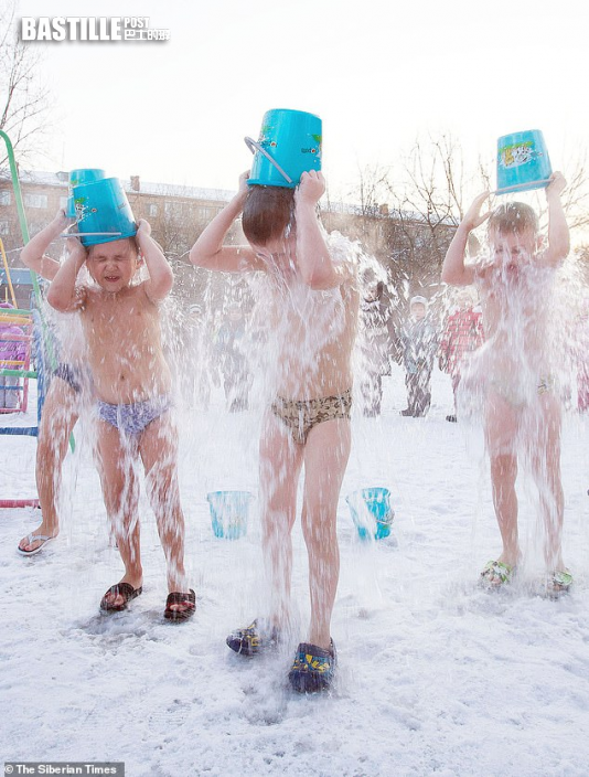 據英國《每日郵報》報道,位於西伯利亞Krasnoyarsk的317號州立幼稚園,是要當日氣溫高於零下25攝氏度,就會讓學童們在每天早上參加「冰桶挑戰」課堂,大家先去焗桑拿暖身,之後只穿內褲集體走到雪地上,將一桶冰水從頭淋下。