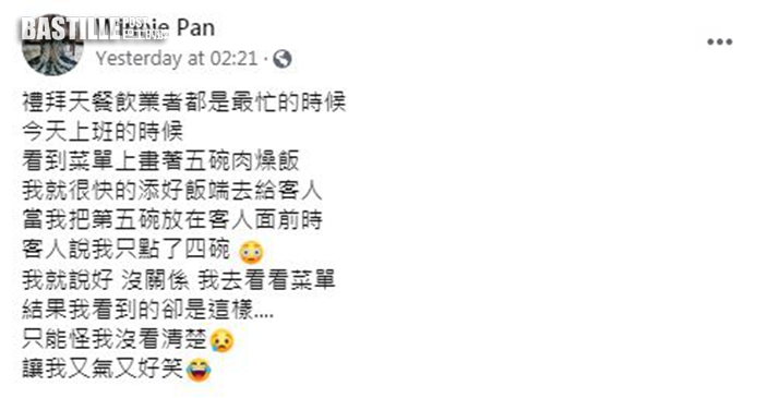台灣網民「Winnie Pan」日前在Facebook群組「爆廢公社公開版」發文,表示星期日都是餐飲業最繁忙的日子,她當日上班時瞥見菜單上以「正」字方式標示5碗肉燥飯,於是馬上添好5碗飯給客人,但當她將第5碗飯端到桌上時,對方竟表示自己僅點了4碗。