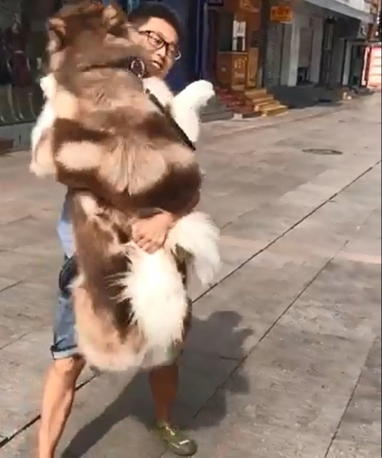▼抱著小狗的路人一臉茫然,他懷裡的小狗也很淡定,根本不懂阿拉斯加在得意什麼。