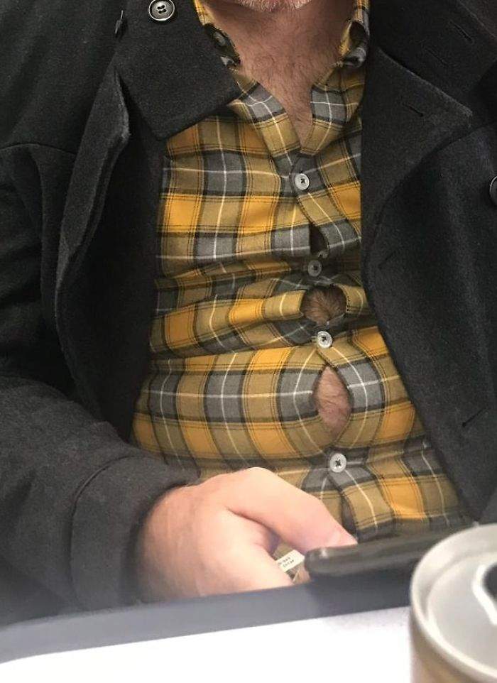 看看那被拉到極限的釦子,就像是要分手的情侶一樣,貌似下一秒就會分道揚鑣,真的很擔心哪一個瞬間會啪一聲地就彈開,光是想像畫面就覺得很爆笑...