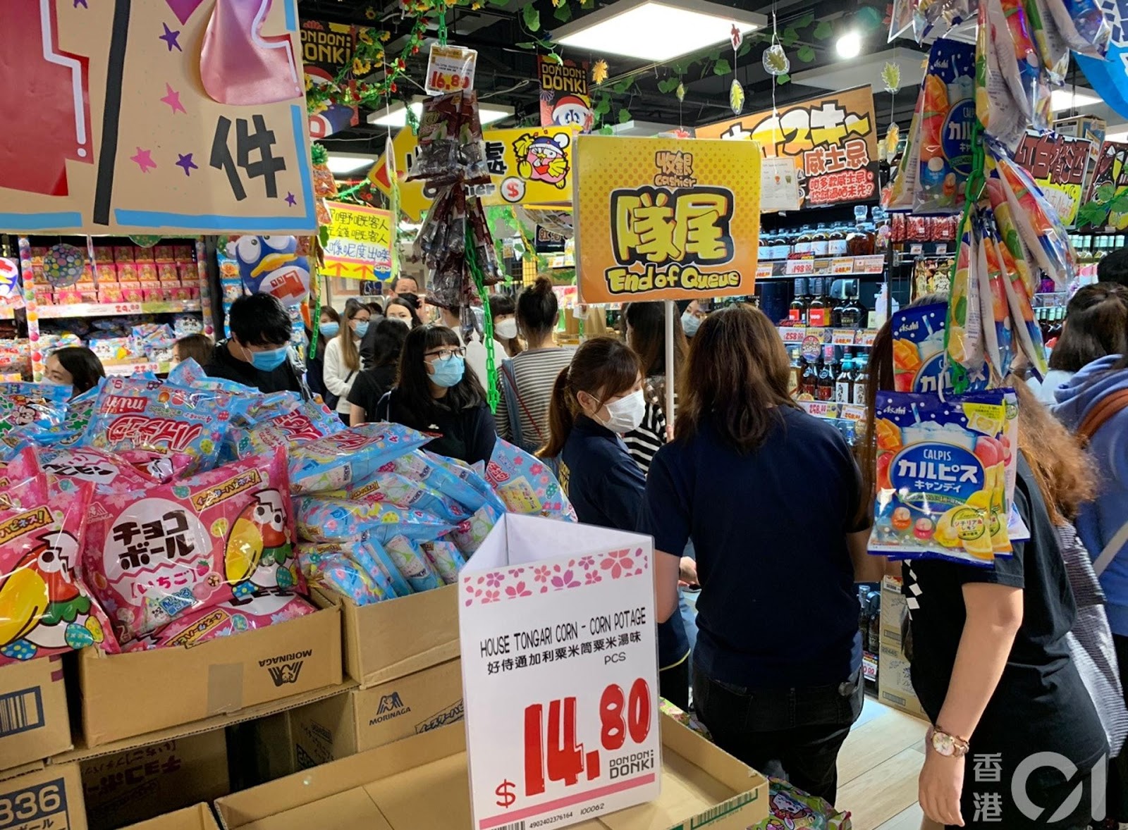 於店內購買日本食物的朱小姐稱,一個月內平均會到驚安殿堂購物兩次,認為店舖貨品種類齊全,又指今日顧客量明顯增加,「比平日多三倍。」她説多人聚集會增加感染,「但香港邊度都多人」,她會佩戴口罩及消毒,又稱有減少外出,「盡量一日買齊啲嘢。」她又留意到近日港人較鬆懈,以尖沙咀為例,月初猶如「死城」,但近日已漸回復多人。