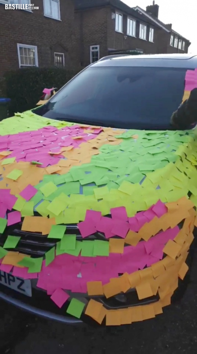 一些無良的車主為了自己方便會將車輛停在別人家的車道或門口,令人十分困擾。最近英國有位男子就遇到這種事情,他準備出門的時候發現有人將車停在自己的車道上,令他無法開車外出,十分氣憤的他於是找來好友合作,將大量的便利貼貼滿擋路的汽車車身,希望能警示對方。