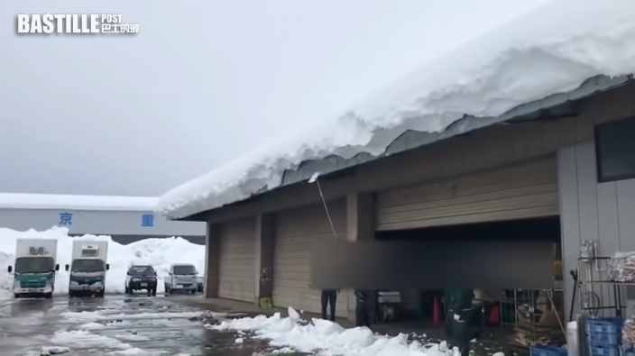 只見片中有一人拿著長長桿子不斷地戳垂落一半積雪,不少小雪塊隨之跌落。不過卻絲毫無法撼動又厚又多的大塊積雪。