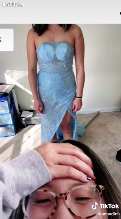 沒想到當實物寄到家中的時候,卻令Anna大失所望,她於是拍片上載到抖音,與大家分享這個慘痛的經歷,「永遠不要相信網購的禮服,嗯。」只見她在影片中貼出了連衣裙的宣傳圖以及自己穿上身的實物圖,真是相差很大,不僅一點不像,還特別奇怪,胸口竟是兩個圓形的白罩,也一點都不顯身材。