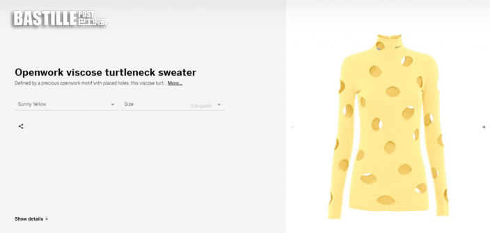 從官網貼出的照片可以見到這款淺黃色的針織衫由模特著上身展示,身上佈滿洞洞,令人聯想到同樣是黃色,上面有一個個窿窿的芝士。