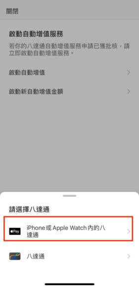 ▲如你是手機八達通的客戶 (iOS裝置的用戶為例),下一步是選擇啟動 iPhone 或 Apple Watch 內的八達通之自動增值功能。