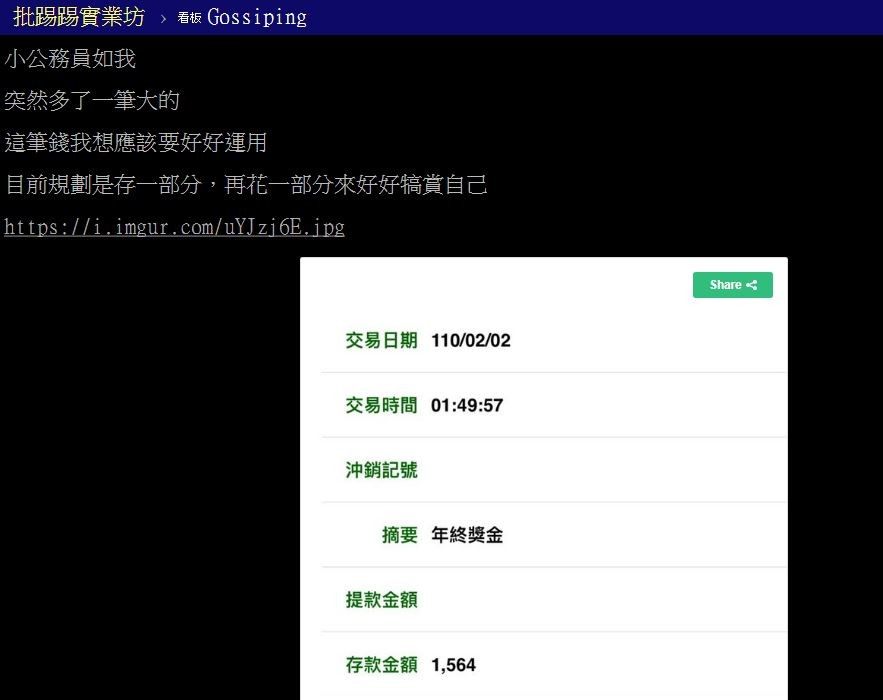 隨著年關將近,各大公司都開始舉行尾牙犒賞員工,雖然今年狀況很差,但是很多公司還是發出年終獎金,希望讓員工一起在新的一年,繼續跟著公司努力,日前就有一名網友在社群平台「PTT」發文說,他在公司只是一個小咖,不過隨著春節即將到來,他也終於嘗到喜氣:「突然多了一筆大的!」開心分享年終獎金,孰料大家看了卻驚呼:「怎麼可能」