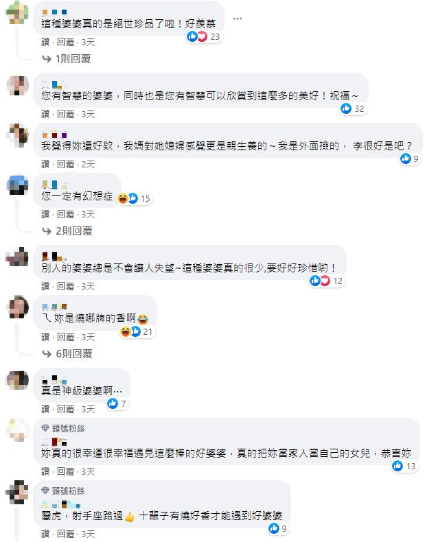 貼文一出引來萬人點讚,網友們紛紛留言表示「婆婆眼裡妳是她的小公主,要珍惜彼此的緣分!」、「能彼此互愛而不是單一的彼此之間都是一種幸福」、「這種婆婆真的是絕世珍品了」、「真的把妳當家人當自己的女兒,恭喜妳」、「妳上輩子拯救過世界嗎?」而不少人也認為原PO是懂得感恩的好媳婦,才能如此珍視婆婆的付出!