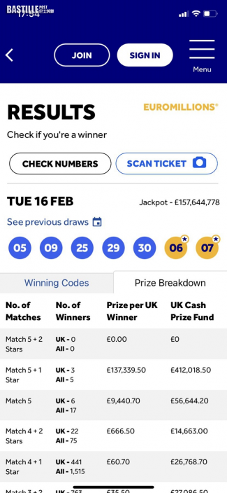 差之毫釐... 蘇格蘭一名24歲男子日前購買「歐洲百萬彩」彩券,頭獎可獲高達1.57億英鎊(約17.3億港元)獎金,當他核對彩券時,發現自己中了6個數字,本來滿心歡喜以為至少贏得二獎。可惜根據玩法,他只贏得4獎,獲分666.5英鎊(約7315港元),令他哭笑不得之餘,大嘆「我不能接受」。
