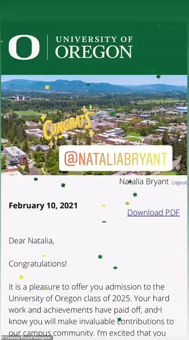 2021年02月18日已故籃球巨星柯比布萊恩(Kobe Bryant)的大女兒,18歲的納塔莉亞(Natalia),被美國名校俄勒岡大學(University of Oregon)錄取,馬上就要成為一名大學新鮮人了。她的媽媽凡妮莎(Vanessa)在IG上分享了這個好消息,表示為女兒感到驕傲!