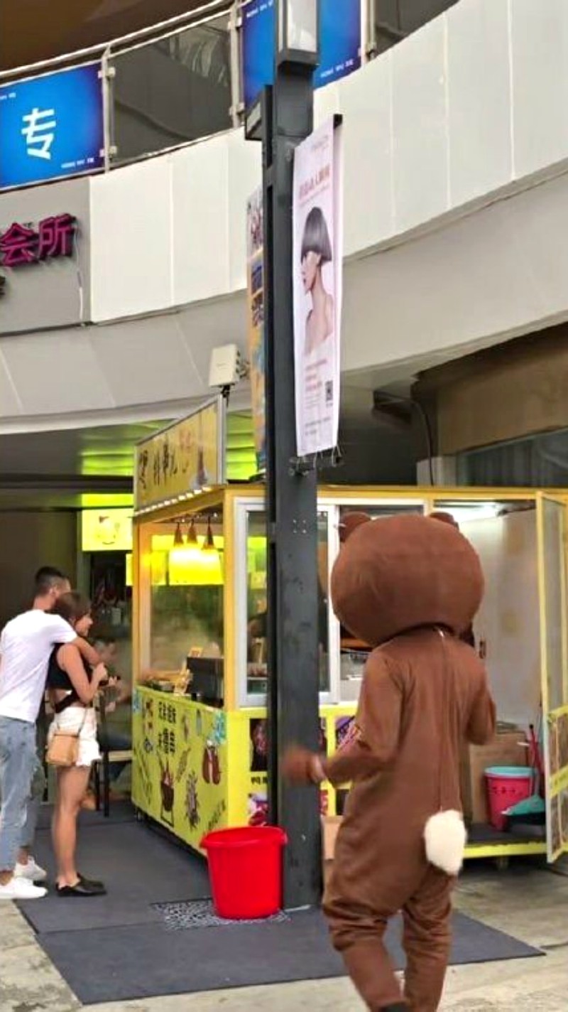只見一系列照片中,穿著熊玩偶裝的男主角出現在一個公眾場合中,站在他對面的是一對互動親暱的男女,女子依偎在後方男子懷抱,模樣看起來相當甜蜜,這一切全被男主角看在眼裡,只見他脫下頭套,默默地注視著心愛的女友背著自己劈腿...