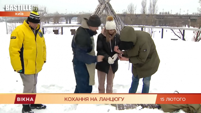 來自烏克蘭的夫妻亞歷山大(Alexander)和維多莉亞(Viktoria)在剛剛過去的情人節當日,前往烏克蘭首都基輔(Kyiv)的Unity雕像前,在國家紀錄院的見證下,用鐵鏈將兩人的手銬在一起,之後兩人的手掌最遠只距離幾公分。