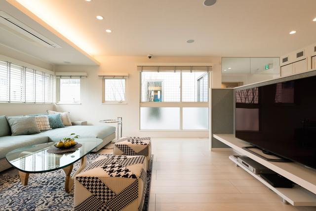 客廳也很寬敞,舒適的沙發靠牆擺放,對面的電視櫃背景牆其實就是個分界點,只有1.2公尺,下面加塊隔板,連電視櫃都有了。