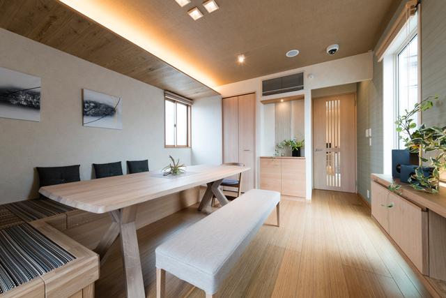 餐廳在客廳的一側,並沒有傳統的餐椅,而是換成了卡座式沙發,這種設計比較適合飯廳。後面的背景牆全都是開放式,上面可以放不少東西。