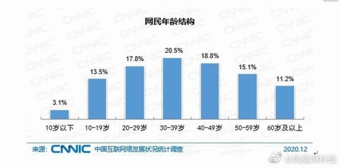 中國傳媒日前報導指,中國互聯網信息中心(CNNIC)發表了《第 47 次中國互聯網絡發展狀況統計報告》,報告中提到截至 2020 年 12 月,中國網民數量達 9.89 億,是全球網民總數的五分一左右。中國於 2020 年 1 月公佈人口已經突破 14 億,換句話說,有 7 成中國人有上網習慣。