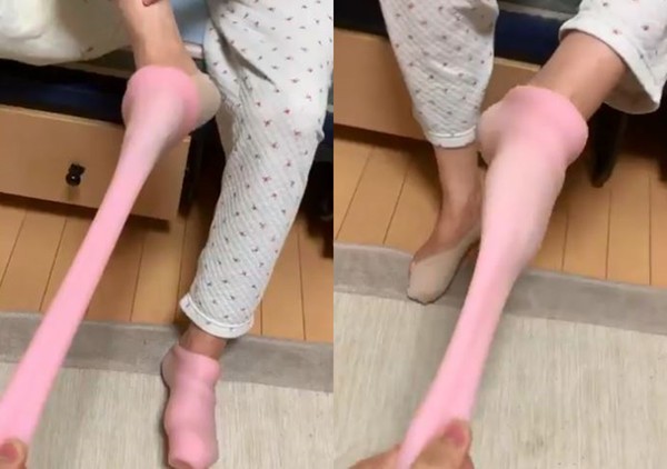 原來阿嬤腳上穿著的,是男生用來解決生理需求的「成人玩具」,乍看之下,還真的非常像襪子,網友馬上衝過去要阿嬤脫掉,影片中可以看到,大家都笑成一團,尤其超有彈性的「襪子」,還直接被拉得超長,讓網友看完都笑翻,直呼:「唉唷~可見有多保暖」、「建議就送給阿嬤了!」、「糟糕,看到阿嬤腳上,有陰影啊!」