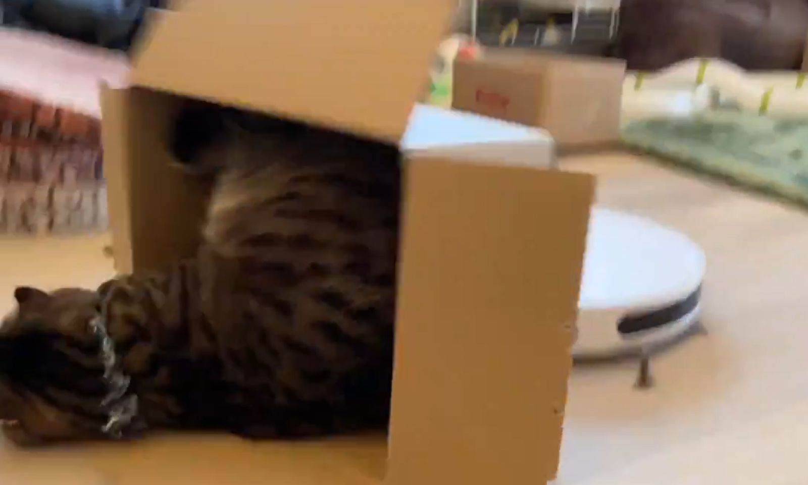 但凡事總會有意外,某天主子跟著掃地機器人旋轉到一半就不小心連箱帶喵一起滾了下來,肥美的屁屁摔在地上的那一瞬間真的會讓人忍不住笑噴出來,還會想一直按下重播鍵!只能說開車真的要注意行車安全,希望主子有保車禍意外險XD