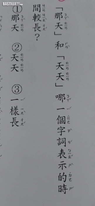 小學功課愈來愈多元化,令不少家長都大感頭痛。有台灣媽媽日前在網上發文,分享其小學二年級孩子的考題,只見問題寫著「那天、天天哪個表示的時間較長?」,令人人百思不得其解,惹來大批網民留言幫忙解答。