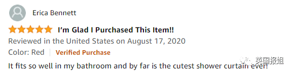 有一個評價這麼寫:我太開心買了這個東西!它太配我的浴室了!是目前為止我買過最可愛的浴簾!