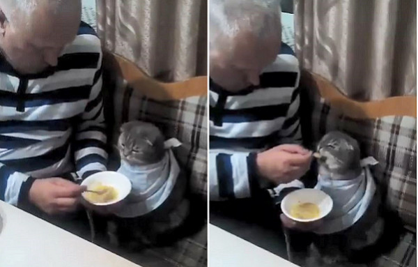 貓咪真的會有融化人心的魅力啊~2017年11月份時,一名女網友Cigdem Avci就在寵物社團中分享了一則影片,只見畫面中一個阿公貼心的用一根湯匙舀起碗中的食物,一口一口的餵主子,畫面簡直甜死人!