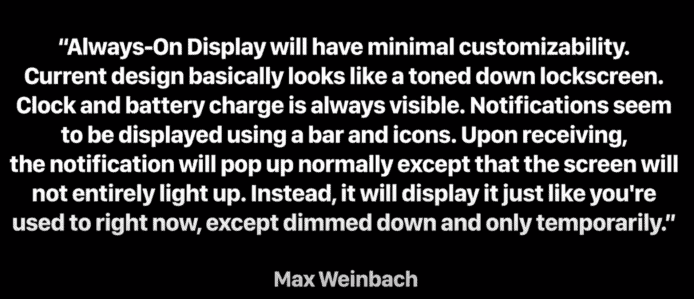 而根據該說法指,若在鎖定螢幕時有通知,將會亮起部分螢幕,並以橫向地以圖標顯示通知,而非如現在一樣亮起整個螢幕。但除了並非亮起整個螢幕外,其餘部分與現時大約不變。但消息是否屬實仍有待 Apple 正式公佈才有辦法證實。