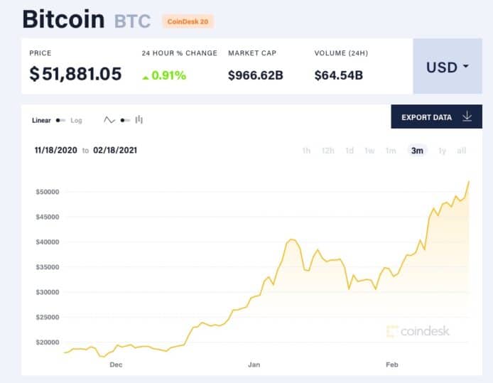 比特幣自昨日起突破 5 萬美元關口,創新高。據交易平台 Coindesk 數據,比特幣在過去 24 小時高見 52,621 美元,截稿時報 51,881.05 美元。