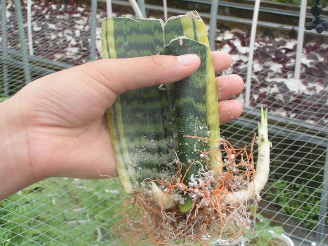 3、然後準備乾淨的河沙或者椰糠,把虎皮蘭的葉片扦插在濕潤的基質中,放在陽台陰涼處進行養護,一般20天左右就能長出根系。
