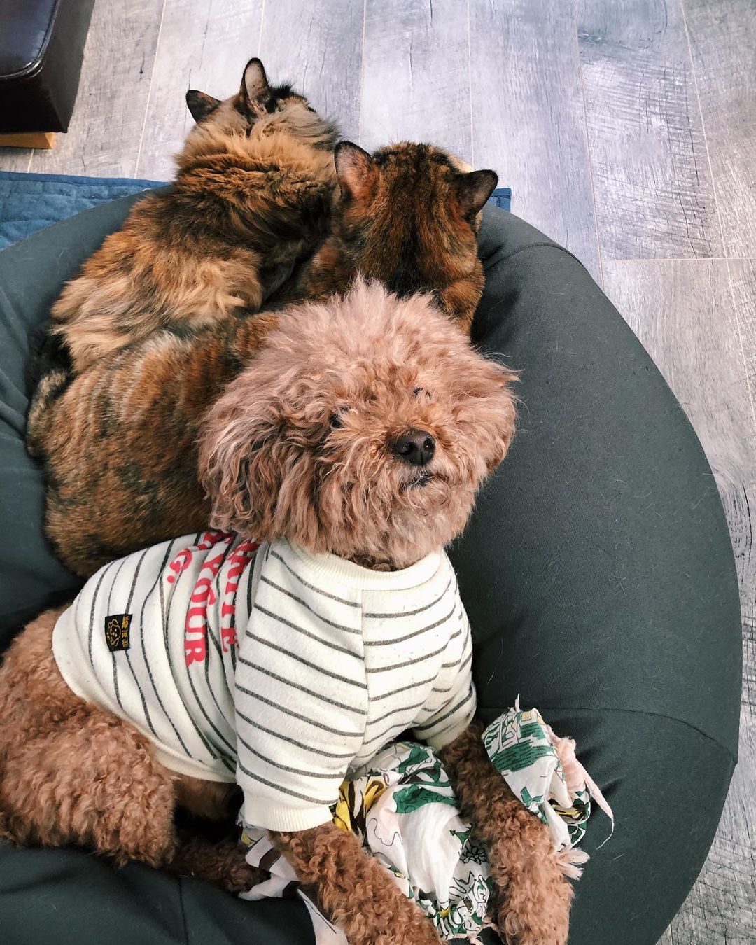 毛孩毫不掩飾做作的反應與表情總是特別逗趣可愛!日本推主@matsugorookoku家中養了1狗2貓2兔,其中貴賓狗狗和2隻分別是長、短毛的玳瑁貓相處得還算不錯,3隻毛孩經常會窩在一起休息、氣氛和樂融融~