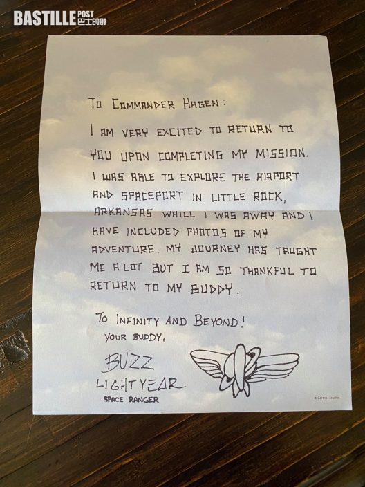 航空公司送上一封「巴斯光年」的手寫信。(網上圖片)