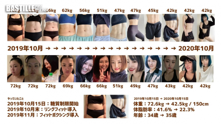 日本34歲網紅柳本瑪麗(ヤナマリ)日前在Twitter上大方公開自己的減肥歷程。身高150cm的她在2019年10月體重高達72公斤,是一名十足的肥妹,從臉型到身材都是圓滾滾的。