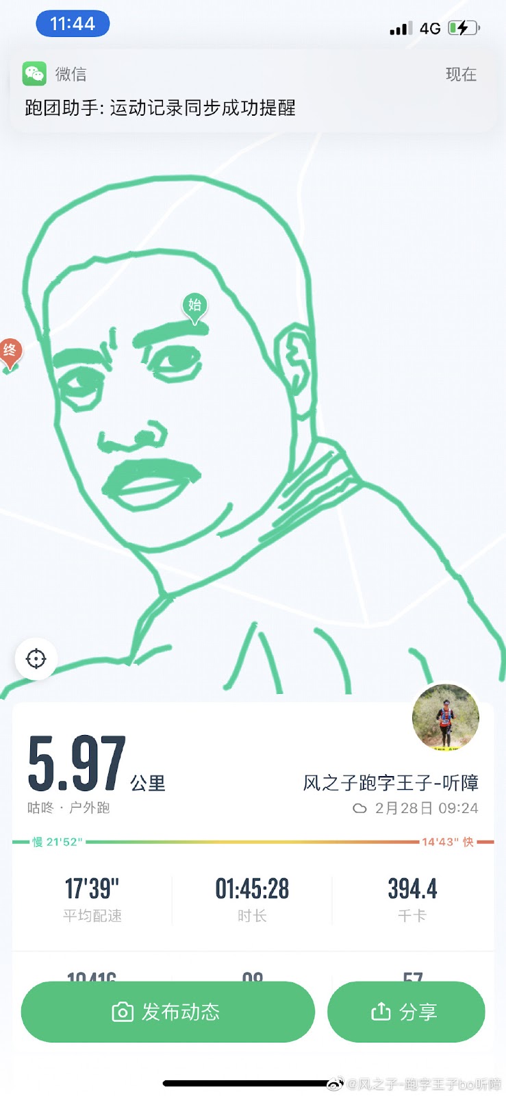 ▼吳姓男子喜歡畫畫、跑步,之前他在網路上看到了「跑圖」,有網友利用跑步app紀錄移動路線的方式,在地圖上作畫。他決定用「跑圖」來紀念吳孟達,先在手機上設計出草圖,再放大到地圖上約5公里大小,然後照著地圖上的路線跑步。他花1小時45分鐘跑了近6公里才完成。