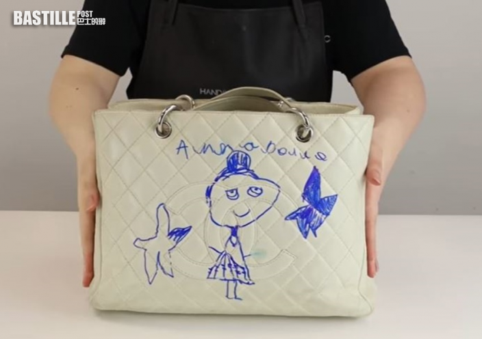 外國專門分享修復名牌產品YouTube頻道Handbag Clinic Official日前上載一段修復Chanel停產GST手袋的影片,影片提及英國一位媽媽將5歲女兒和Chanel白色GST袋共處一室,女兒見手袋太單調,決定為它多添一點色彩,用Marker在手袋上畫上自畫像,並加上星星作點綴,最後更寫上自己的名字Annabelle。
