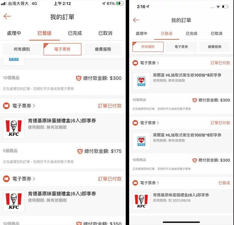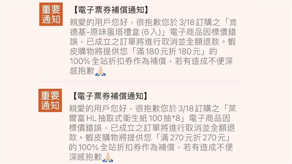 因此本日下午蝦皮雖然宣稱對於商品標價錯誤深感抱歉,但目前已經將成立的訂單全數取消退款,並決定以補償的方式回饋消費者!目前購買「肯德基原味蛋塔禮盒(6入)」的消費者,蝦皮將補償每人「滿180元折180元」的全站折扣券,提供消費者100%折抵...